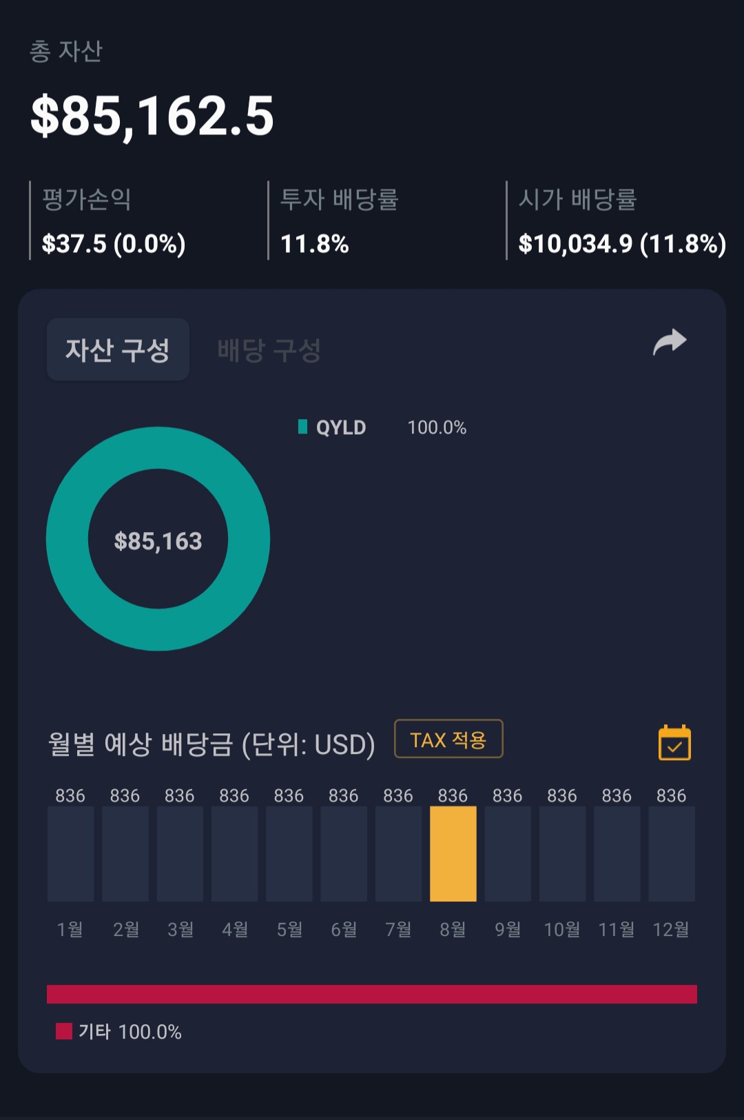 그랬더니 제가 QYLD에 약 1억을 투자했을 때 받을 수 있는 월 배당금은 약 836불로 현재 환율을 적용하면 한화로 약 977,000원 그러니깐 얼추 100만 원이라는 금액이 나왔습니다.