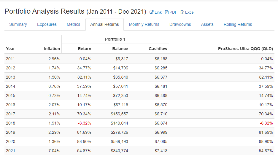 아래 결과에서 보시는 바와 같이 만일 2011년부터 2021년까지 매월 60만원(미화 500불)씩 QLD에 적립식 투자를 했었다면 총 누적수익이 $843,774으로 현재 환율 1204원으로 계산하면 한화로 약 10억 1천6백30만 원입니다.